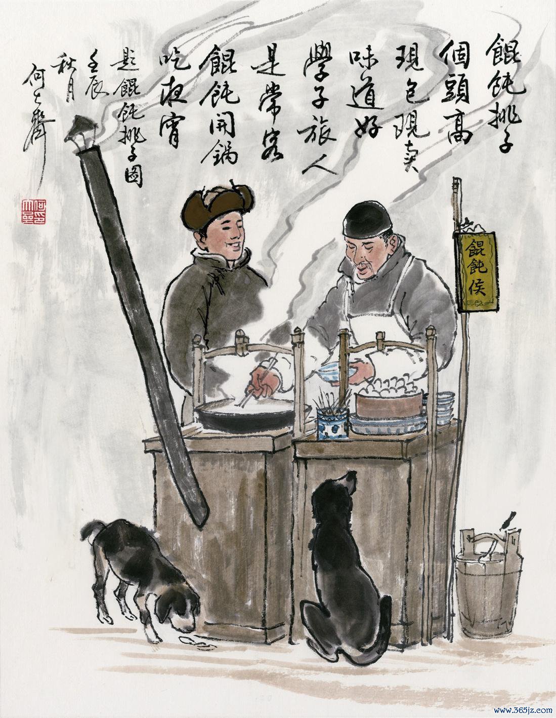 老年间每至立冬时节,京城街头便有好多挑着馄饨担子的商贩穿梭其中。这些特制的馄饨担子,一头是煮着汤锅的小炉子,另一头则是一个小木柜,柜内抽屉里整都地摆放着述料、碗筷以及事前准备好的皮和馅。商贩们挑着担子,边走边吆喝,每当遭受门客,便现场包制、煮制馄饨,再盛入白瓷碗中。